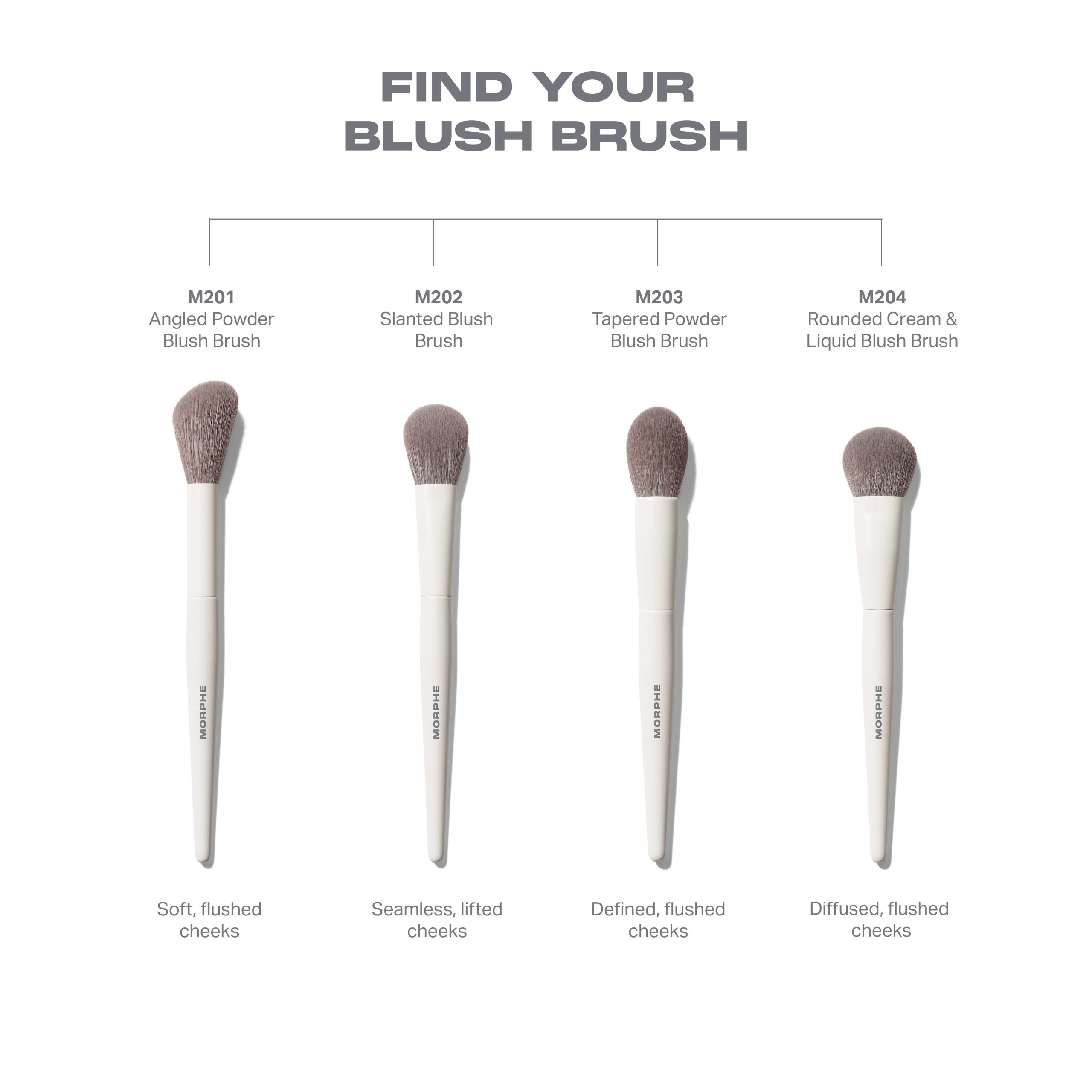 The fluffy, flexible angled tip of the M201 Angled Powder Blush Brush helps perfects a pinch of cheek color. Use it as well to gently tap powder blush over cream or liquid blush. It will set the application, without disturbing the product underneath.